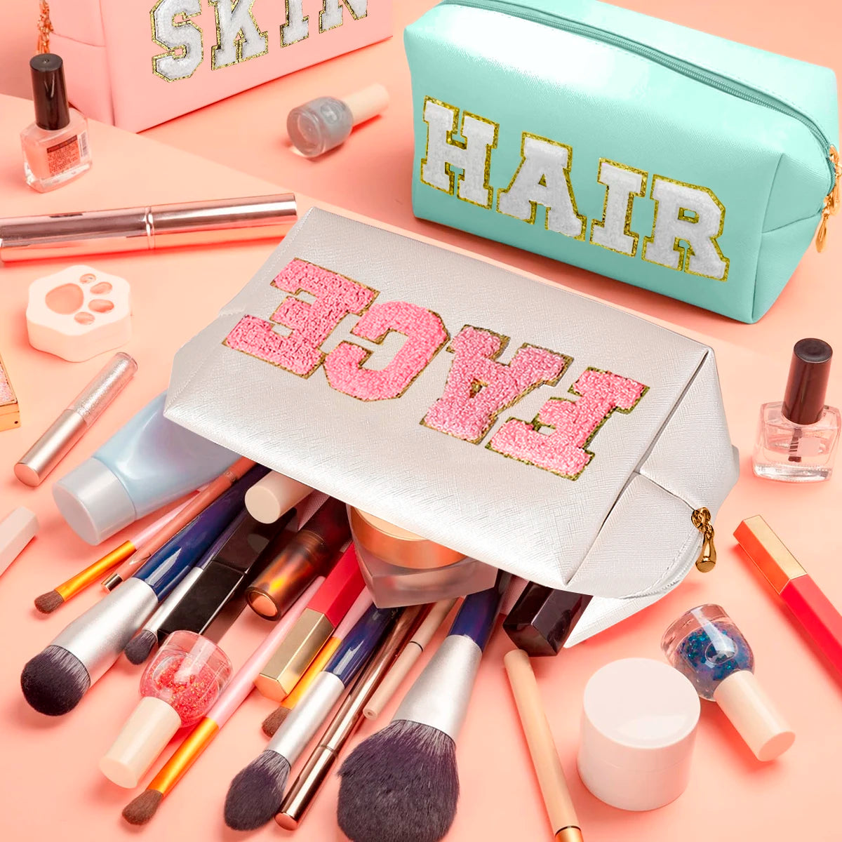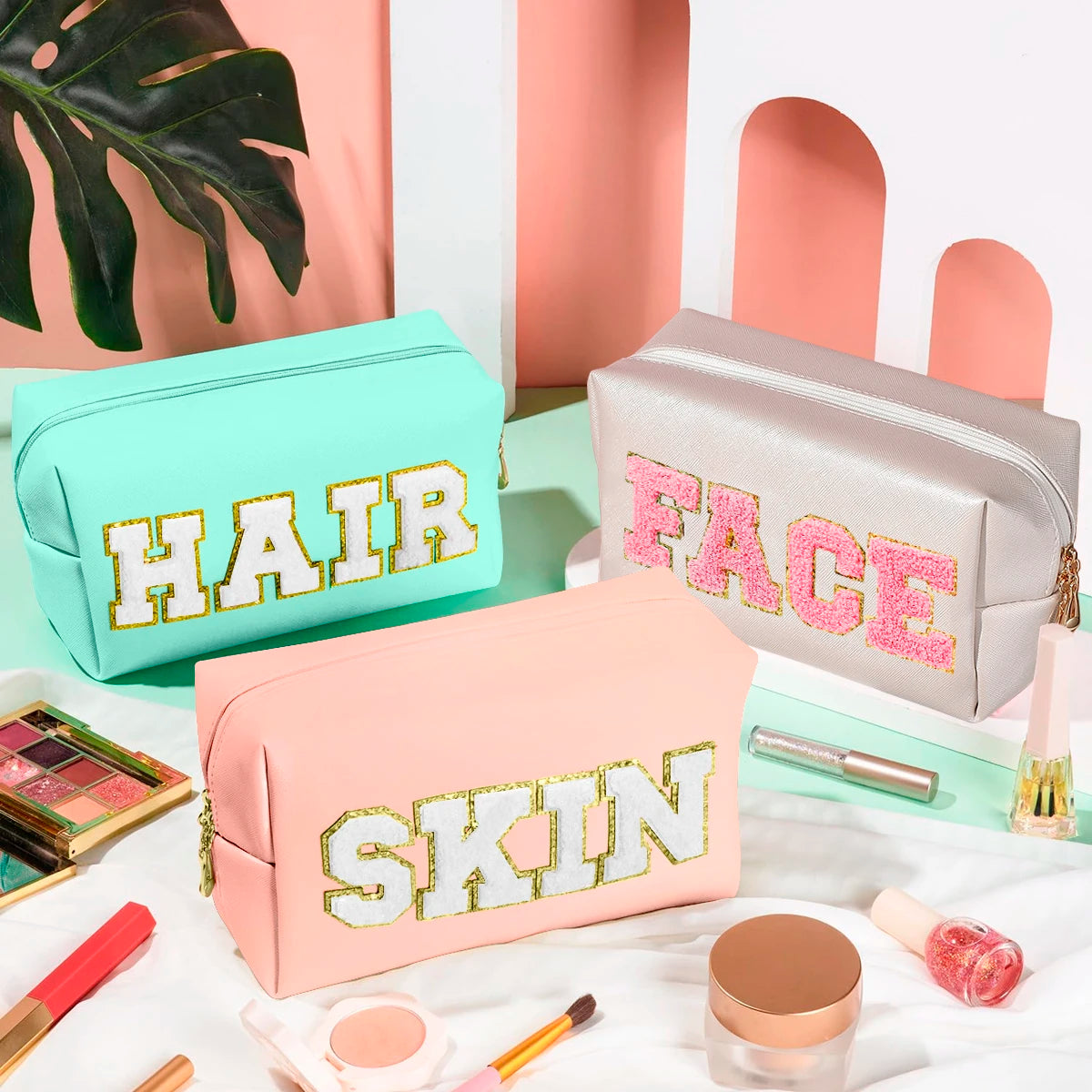 Keep your essentials organized with this stylish chenille letter cosmetic bag. Made with waterproof PU leather and a secure zipper closure, it's perfect for storing skincare, makeup, and hair products at home or on the go.